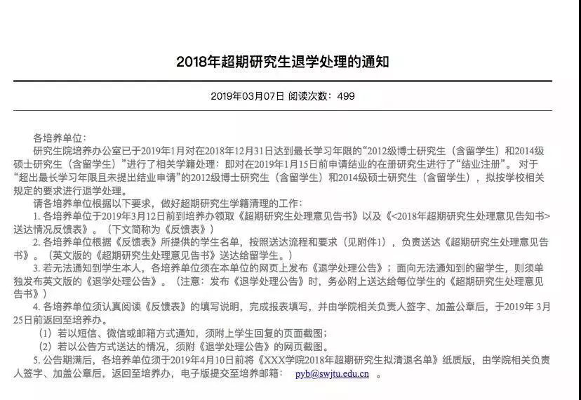 對(duì)于"超出最長(zhǎng)學(xué)習(xí)年限且未提出結(jié)業(yè)申請(qǐng)"的2012級(jí)博士研究生(含留學(xué)生)和2014級(jí)碩士研究生(含留學(xué)生),擬按學(xué)校相關(guān)規(guī)定的要求進(jìn)行退學(xué)處理。