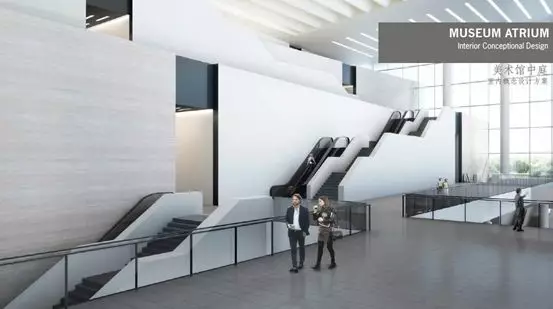 在美術(shù)館中,設(shè)計(jì)著力打造共享平臺(tái)廣場(chǎng),這里是對(duì)市民開放的空間,通過多層級(jí)平臺(tái)的設(shè)計(jì),讓建筑的廣場(chǎng)空間與室內(nèi)空間交融貫穿,尤其是獨(dú)具特色的25米高的雨蓬覆蓋下,是美術(shù)館的戶外雕塑廣場(chǎng)。