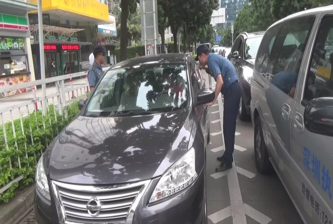 執(zhí)法人員例行對(duì)車牌號(hào)為粵BT***的小轎車進(jìn)行檢查,司機(jī)將車窗降下,緩緩駛?cè)氪龣z區(qū)域。