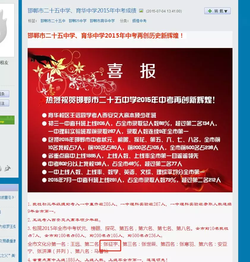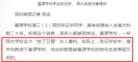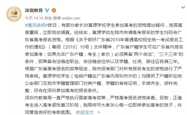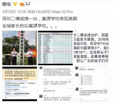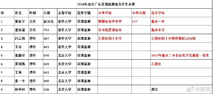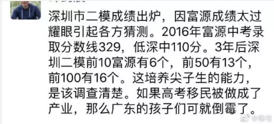 近日,深圳高三二模成績(jī)出爐,一所學(xué)校引起了深圳家長(zhǎng)圈的高度關(guān)注。 有網(wǎng)友在微博上報(bào)料富源學(xué)校表現(xiàn)亮眼,一石激起千層浪,事件是怎么一回事呢?一起來(lái)看看 2019深二模各校尖子生成績(jī) 其中民辦學(xué)校寶安區(qū)富源學(xué)校異軍突起,尖子生占比遠(yuǎn)超深圳最好的四大高中(深圳中學(xué),深圳實(shí)驗(yàn)中學(xué),深圳外國(guó)語(yǔ)學(xué)校,深圳高級(jí)中學(xué)),引人注目。 網(wǎng)友議論紛紛 網(wǎng)友@相宅稱:深圳富源中學(xué),18年考中清北的學(xué)生名單和初中來(lái)源統(tǒng)計(jì),經(jīng)過(guò)人肉搜索和大數(shù)據(jù)比對(duì),確認(rèn)相關(guān)證據(jù),有非常大的高考移民嫌疑。廣東高考本來(lái)就難,名校指標(biāo)更少,還來(lái)擠占惹起公憤。同時(shí)附上19年深圳高考二模的富源成績(jī)。今年還有沒(méi)有高考移民,還會(huì)不會(huì)擠占廣東的名校指標(biāo)? 針對(duì)網(wǎng)上的報(bào)料和家長(zhǎng)的質(zhì)疑,深圳教育局@深圳教育回應(yīng)稱 情況說(shuō)明 #情況說(shuō)明#昨日,有部分家長(zhǎng)對(duì)富源學(xué)校學(xué)生參加高考的資格提出疑問(wèn),我局高度重視,立即啟動(dòng)調(diào)查。經(jīng)核實(shí),富源學(xué)校在我市申請(qǐng)高考報(bào)名的學(xué)生均符合廣東省高考報(bào)名資格。根據(jù)《關(guān)于做好廣東省2019年普通高校招生統(tǒng)一考試報(bào)名工作的通知》(粵招〔2018〕15號(hào))文件精神,廣東省戶籍學(xué)生可在廣東省內(nèi)報(bào)名參加高考;如果為非廣東戶籍,考生(家長(zhǎng))必須具備“兩個(gè)合法”、“三個(gè)三年”的條件,即具備合法穩(wěn)定職業(yè)、合法穩(wěn)定住所以及學(xué)籍、社保、居住證各滿三年。根據(jù)廣東省高考報(bào)名的政策規(guī)定,我市招考部門(mén)對(duì)所有報(bào)名考生的資格進(jìn)行了嚴(yán)格審核。富源學(xué)校學(xué)生(包括戶籍在廣東省內(nèi)深圳市外的)均提供了戶籍所在地公安部門(mén)及我市學(xué)籍管理部門(mén)對(duì)其戶籍、學(xué)籍的審核證明,手續(xù)齊全、資料完整,符合在深圳參加高考的報(bào)名條件。 深圳市教育局一直嚴(yán)格執(zhí)行國(guó)家高考政策,嚴(yán)格高考報(bào)名資格審查。目前,正值考生進(jìn)入高考緊張復(fù)習(xí)階段,我局呼吁大家關(guān)心每一位即將參加高考的孩子,共同營(yíng)造良好的考前氛圍。 回應(yīng)之下,小編根據(jù)現(xiàn)有的資料,發(fā)現(xiàn)了這些信息出入,一起接著往下看! 對(duì)比:富源學(xué)校深圳一模成績(jī) 成績(jī)單顯示,在前十名單里,富源學(xué)校獨(dú)占6位,而深圳四大公辦重點(diǎn)高中總和也只有4位,這是什么情況?對(duì)照看一看一模成績(jī): 三年來(lái)深圳中考錄取情況: 富源學(xué)??梢?jiàn)生源不占優(yōu)勢(shì) 再來(lái)看一看三年來(lái)深圳中考錄取情況:富源學(xué)校可見(jiàn)生源并沒(méi)有什么優(yōu)勢(shì),總分460分的錄取分?jǐn)?shù)比四大重點(diǎn)低了將近100分,但也不能因此說(shuō)明該學(xué)校沒(méi)有尖子生源。 2018年富源學(xué)校高考清北名單:9位同學(xué)上清北 下圖是2018年幾所大學(xué)在廣東(理科)招生計(jì)劃: 但是,這幾名考進(jìn)清北的同學(xué),名字竟然出現(xiàn)在兩所不同的高中??? 考進(jìn)廣東前20名的張征宇同學(xué) 網(wǎng)友爆料稱,深圳富源中學(xué)2018年高考喜報(bào),特別宣傳了張征宇同學(xué)(后成功考入清華大學(xué))。而他也出現(xiàn)在2015年的邯鄲市育華中學(xué)中考喜報(bào)上。乾坤大挪移,坐地日行八萬(wàn)里! 家長(zhǎng)質(zhì)疑:富源中學(xué)光榮榜的同學(xué) 怎么又出現(xiàn)在衡水中學(xué)喜報(bào)上? 針對(duì)上面9位同學(xué),搜索信息顯示,竟然有五位同學(xué)來(lái)自有名的高考大省河北。 在2018年的第31和32屆化學(xué)奧林匹克競(jìng)賽的名單上,有一個(gè)共同的名字:崔一龍,但他們來(lái)自不同的學(xué)校。高二時(shí)他在衡水第一中學(xué),高三他出現(xiàn)在深圳富源中學(xué)。 同時(shí),該網(wǎng)友還發(fā)了一封 #一位深圳中學(xué)生家長(zhǎng)寫(xiě)給教育部的控訴信# 尊敬的國(guó)家教育部領(lǐng)導(dǎo): 您好! 我是深圳市一名中學(xué)生的家長(zhǎng)。這幾日網(wǎng)上流傳出一份深圳市高三年級(jí)第二次模擬考試前幾名學(xué)校分布成績(jī)單,其中民辦學(xué)校寶安區(qū)富源學(xué)校異軍突起,遠(yuǎn)超深圳最好的四大高中(深圳中學(xué),深圳實(shí)驗(yàn)中學(xué),深圳外國(guó)語(yǔ)學(xué)校,深圳高級(jí)中學(xué))引起廣大家長(zhǎng)的關(guān)注。隨后網(wǎng)上流傳出是富源學(xué)校與河北衡水中學(xué)之間的高考移民消息,具體操作是通過(guò)將河北衡水中學(xué)的尖子生戶口轉(zhuǎn)移到深圳富源學(xué)校,平時(shí)在衡水中學(xué)上課,考試在深圳富源學(xué)校,并參加深圳市高考。此情況幾年前已有,數(shù)量沒(méi)有那么大。今年突然大量此類考生出現(xiàn),大家猜測(cè),如果不加管控未來(lái)必將愈演愈烈。 作為一名普通深圳市民和學(xué)生家長(zhǎng),我守法遵紀(jì),但是實(shí)在難以接受這樣的現(xiàn)實(shí)。希望教育部能夠徹查此事,查明真相,還廣大家