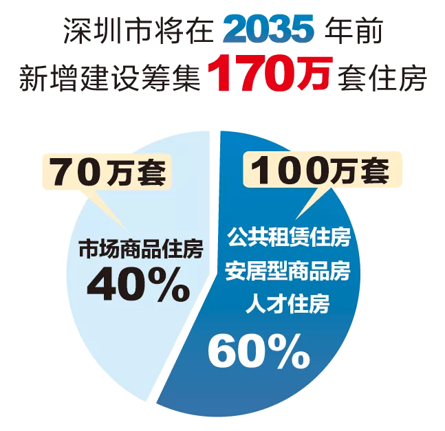 市住建局相關(guān)負(fù)責(zé)人介紹,2018年8月,市政府出臺(tái)了《關(guān)于深化住房制度改革加快建立多主體供給多渠道保障租購并舉的住房供應(yīng)與保障體系的意見》(以下簡稱“主文件”)。新時(shí)代,深圳市將針對不同收入水平的居民和專業(yè)人才等各類群體,著力構(gòu)建多層次、差異化、全覆蓋的住房供應(yīng)與保障體系,努力實(shí)現(xiàn)全體市民住有所居?!爸魑募碧岢錾钲谑袑⒃?035年前新增建設(shè)籌集170萬套住房,其中:市場商品住房70萬套,占40%左右;公租房、安居型商品房和人才住房共100萬套,占60%左右。
