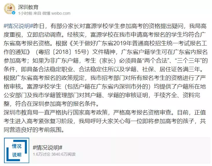 該回應(yīng)稱:經(jīng)核實(shí),富源學(xué)校學(xué)生均提供了戶籍所在地公安部門及我市學(xué)籍管理部門對其戶籍、學(xué)籍的審核證明,手續(xù)齊全、資料完整,符合在深圳參加高考的報(bào)名條件。