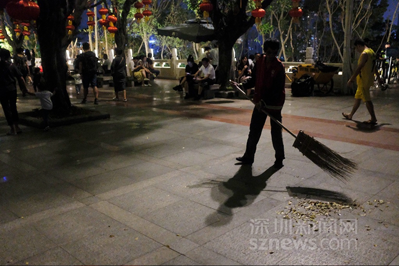 21時(shí),燈光秀結(jié)束后,蓮花山公園山頂廣場(chǎng)打掃衛(wèi)生的環(huán)衛(wèi)工(楊浩翰 攝)