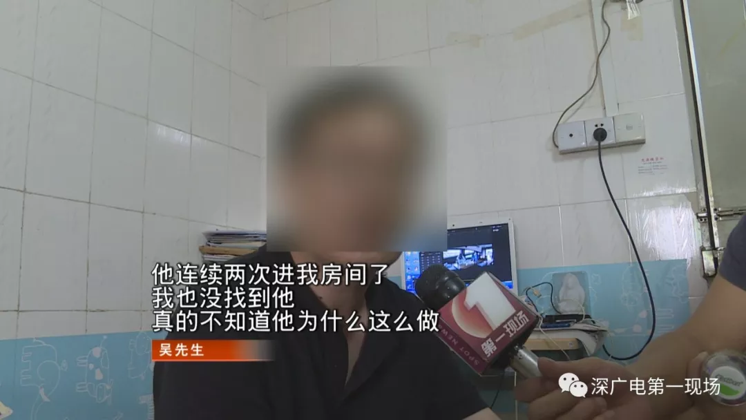 被驚醒的吳先生發(fā)現(xiàn)后,男子在7點19分離開吳先生房間??吹竭@兩段監(jiān)控,吳先生有點后怕。