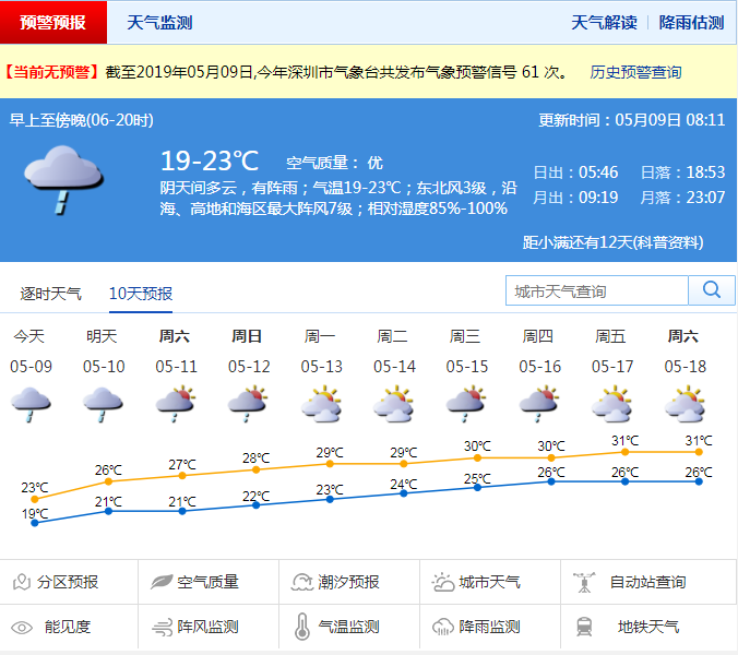 市氣象局預(yù)計(jì),9日深圳以陰天天氣為主,有中到大雨,局部暴雨;氣溫在19-23℃;沿海、高地和海區(qū)最大陣風(fēng)6-7級。10-11日以多云天氣為主,有短時(shí)陣雨。12日起多云,氣溫明顯回升。