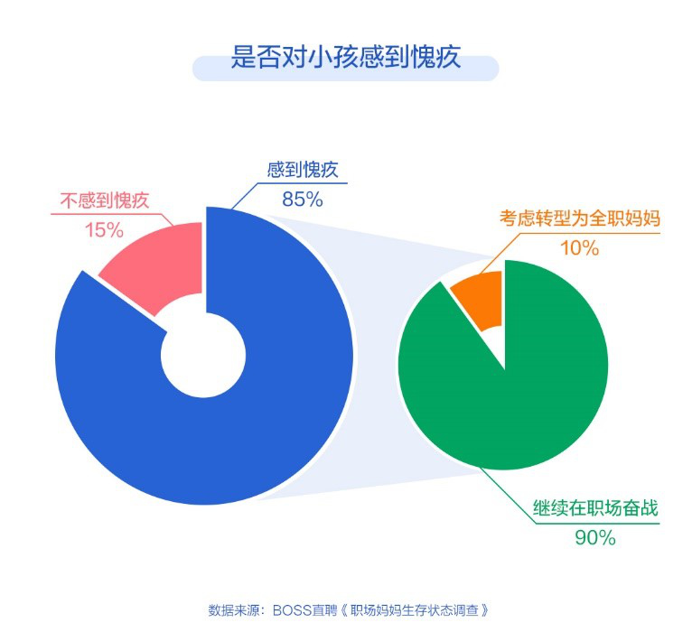 根據(jù) BOSS直聘發(fā)布的《2019職場媽媽生存現(xiàn)狀調(diào)查報(bào)告》,有65%的受訪職場媽媽認(rèn)為自己有潛在的抑郁傾向,逾八成媽媽對孩子感到愧疚,工作時(shí)長是職場媽媽在工作中最為看重的要素。一面是嗷嗷待哺的孩子,一面是苦心經(jīng)營的工作,事業(yè)與家庭的平衡或成職場媽媽焦慮的根源。