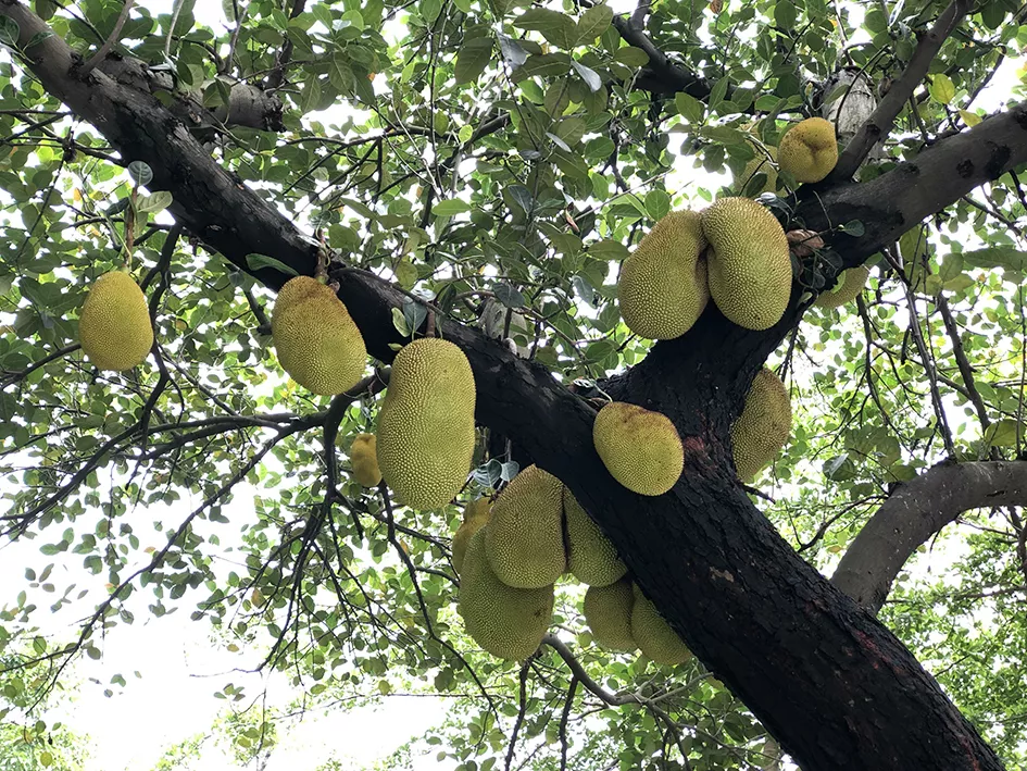 蛇口消息報2019年5月13日訊 日前,有居民向消息報反映,蛇口公園北路靠近蛇口體育中心一側(cè)幾百米的人行道上種植60余棵菠蘿蜜樹,樹上掛了不少果實,蔚為壯觀,儼然成為路上一景。不過也擔心碩大的菠蘿蜜會掉落砸傷路人。