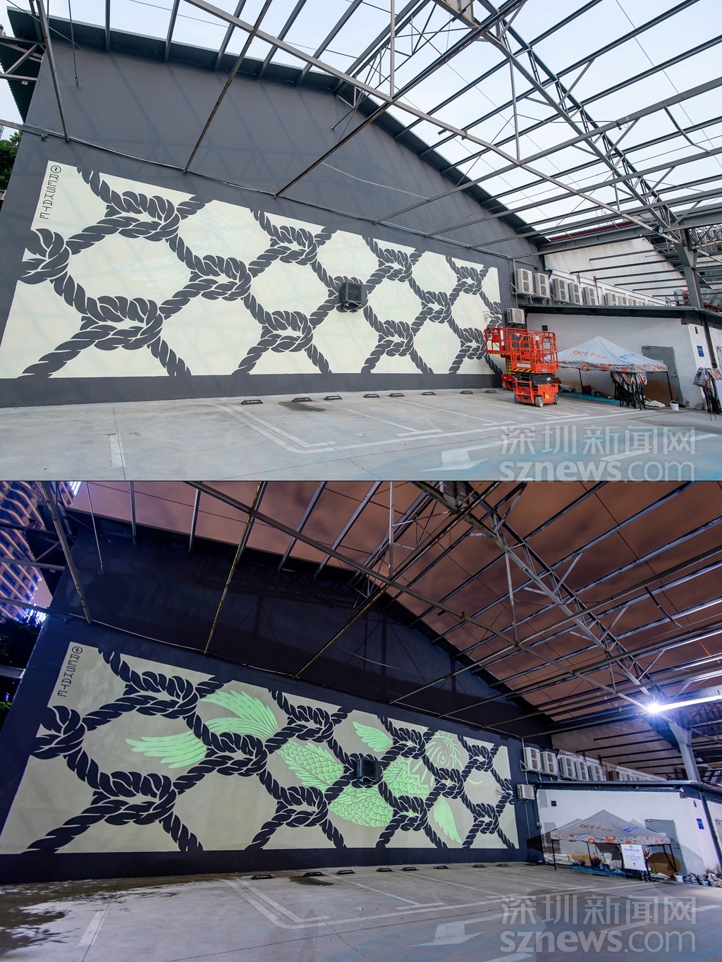 夜光涂鴉作品《連接》日與夜對(duì)比圖(主辦方供圖)