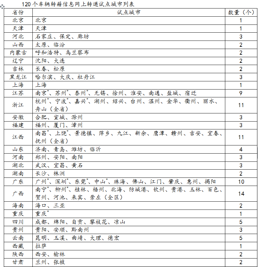 4.擴大車輛轉籍信息網(wǎng)上轉遞試點。在原有15個試點城市的基礎上,進一步擴大非營運小微型載客汽車檔案電子化網(wǎng)上轉遞試點,在直轄市、省會市、自治區(qū)首府市、計劃單列市全部推行,同時各?。▍^(qū))至少再選擇1至2個城市推行。對機動車在試點城市之間轉籍的,申請人可以直接到車輛遷入地車輛管理所申請并辦理,無需再回遷出地驗車、提取紙質(zhì)檔案。