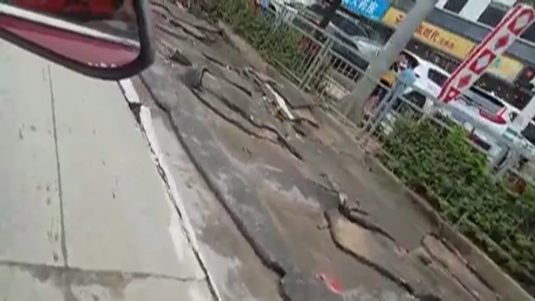一場(chǎng)暴雨過(guò)后,寶安石巖石龍大道剛鋪好的瀝青路成了渣渣!
