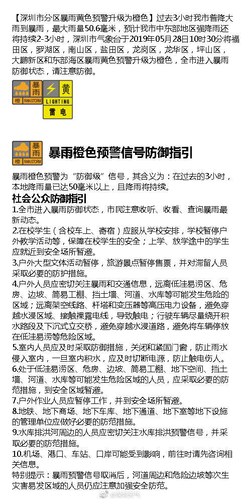 【深圳市分區(qū)暴雨黃色預(yù)警升級(jí)為橙色】過(guò)去3小時(shí)我市普降大雨到暴雨,最大雨量50.6毫米,預(yù)計(jì)我市中東部地區(qū)強(qiáng)降雨還將持續(xù)2-3小時(shí),深圳市氣象臺(tái)于2019年05月28日10時(shí)30分將福田區(qū),羅湖區(qū),南山區(qū),鹽田區(qū),龍崗區(qū),龍華區(qū),坪山區(qū),大鵬新區(qū)和東部海區(qū)暴雨黃色預(yù)警升級(jí)為橙色,全市進(jìn)入暴雨防御狀態(tài),請(qǐng)注意防御。