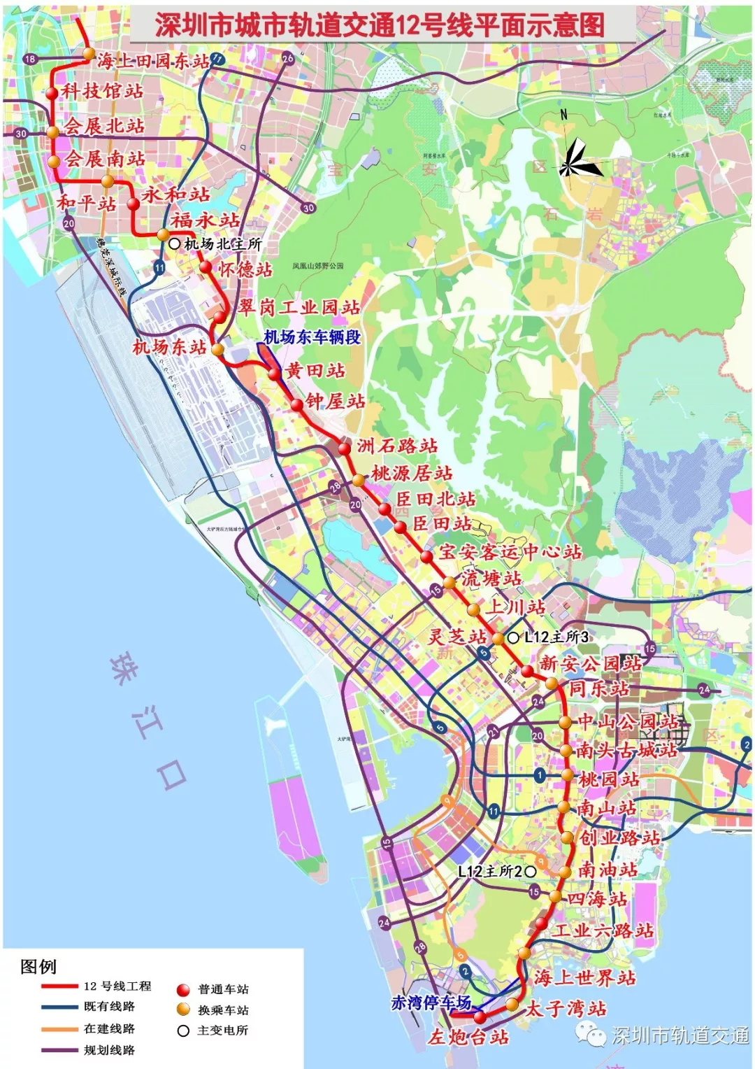 深圳地鐵12號線線路起自左炮臺站,終至海上田園東站;線路全長約40.54km,全線采用地下敷設(shè)方式;共設(shè)站33座,其中換乘站18座。