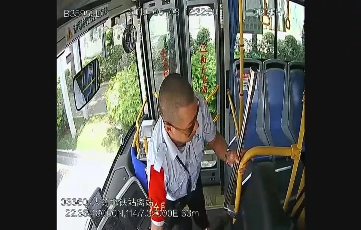 監(jiān)控顯示:6月8日中午12點27分左右,司機熊師傅正常駕駛車輛,這時身旁的一名穿黑色上衣的男乘客突然跌倒在地。熊師傅發(fā)現(xiàn)后,急忙將車輛行駛到安全地帶停放,并向男乘客詢問情況。
