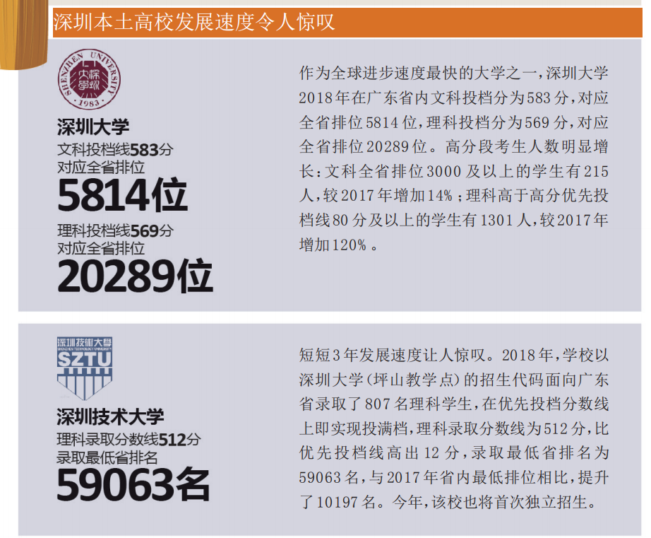 作為全球進步速度最快的大學之一,深圳大學2018年在廣東省內(nèi)文科投檔分為583分,對應(yīng)全省排位5814位,理科投檔分為569分,對應(yīng)全省排位20289位。高分段考生人數(shù)明顯增長:文科全省排位3000及以上的學生有215人,較2017年增加14%;理科高于高分優(yōu)先投檔線80分及以上的學生有1301人,較2017年增加120%。