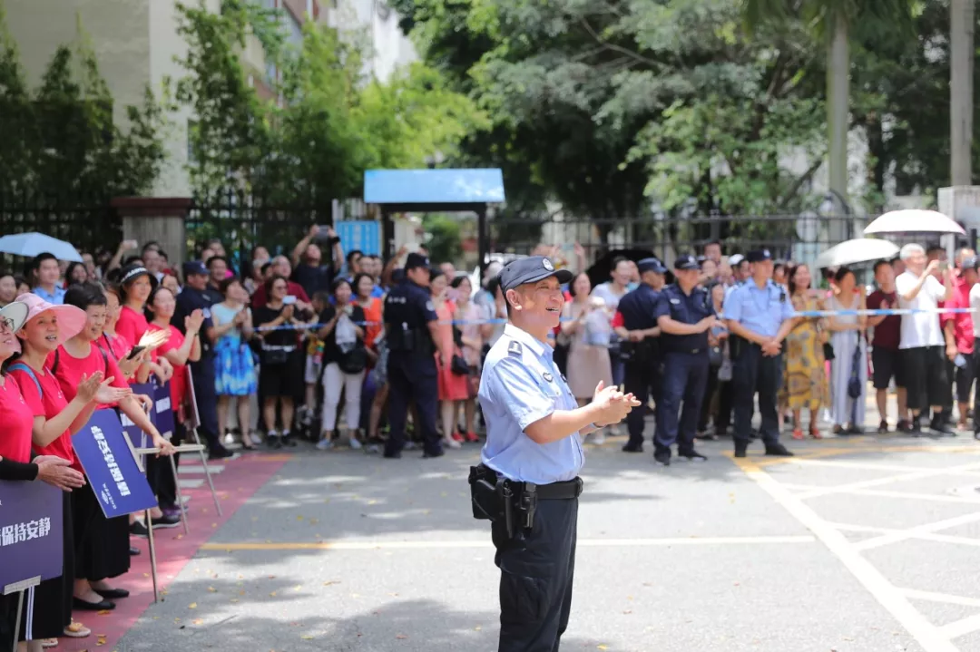 △當(dāng)?shù)谝晃豢忌叱錾钲趯?shí)驗(yàn)學(xué)校中學(xué)部考場時(shí),通心嶺派出所所長林志強(qiáng)與現(xiàn)場家長為其鼓掌喝彩。