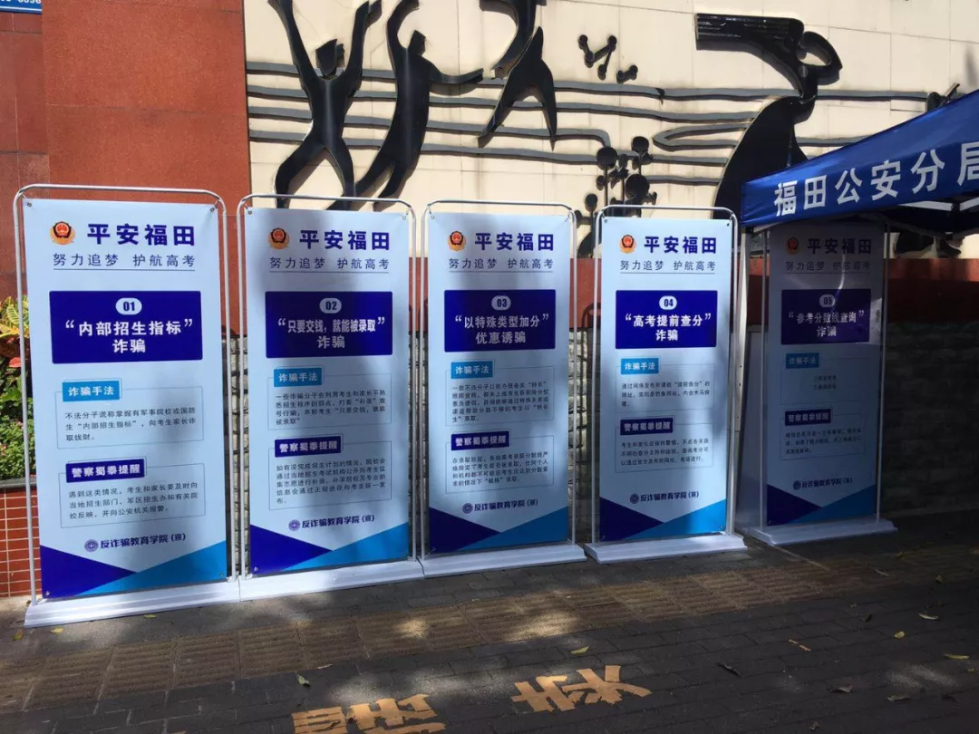 高考結(jié)束后,與高考相關(guān)的一些詐騙也進(jìn)入了活躍高峰期。福田分局制作了高考反詐騙相關(guān)展板,在全區(qū)范圍內(nèi)的6個(gè)考點(diǎn)出入口顯眼處擺放,提醒告誡考生及家長注意高考相關(guān)詐騙手法。