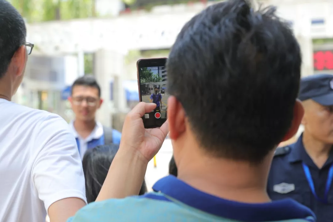 △考場外焦急等待的考生家長紛紛拿出手機(jī)準(zhǔn)備拍攝邁出考場的孩子。