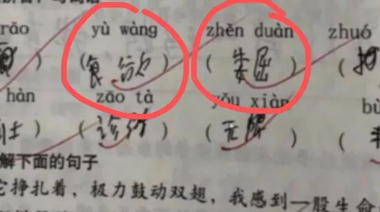 可是仔細一瞧,卻發(fā)現了蹊蹺。明明題目是讀拼音,寫詞語,可是孩子寫的詞語和上面的拼音,完全對不上號,老師卻依舊打了對勾。