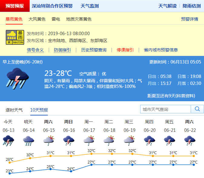 深圳新聞網(wǎng)2019年6月13日訊(記者 施冰冰)深圳市氣象局預(yù)計(jì)13日凌晨至夜間我市有暴雨、局部大暴雨,伴有雷暴,局部地區(qū)有8級左右的短時(shí)大風(fēng)。14日白天降雨逐漸減弱。15-16日多云,有陣雨或雷陣雨,17-19日多云炎熱。