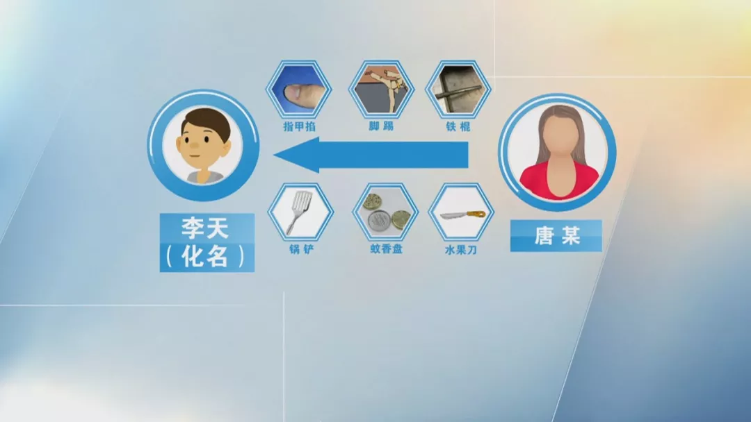 5月30號,唐某以李天洗碗沒洗干凈為由,用金屬漏勺抽打其手臂背部及頭部,導致李天頭部嚴重出血,后經鑒定為輕微傷。