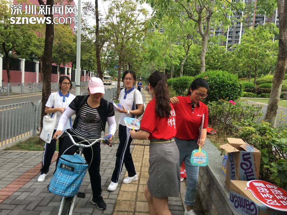 校外的卓越教育機(jī)構(gòu)正在向考生分發(fā)扇子和礦泉水