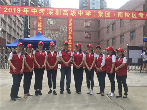 在深圳高級中學考點校門前,10位穿著紅色義工服的家長義工早早來到現場迎接考生、疏導人流、為考生加油。據深圳高級中學家委會會長馮女士介紹,中考期間,家委會將有數十位家長參與現場人流疏導、維持秩序,每天分為四個輪次,每科考試前后都各有10名家長義工參與。