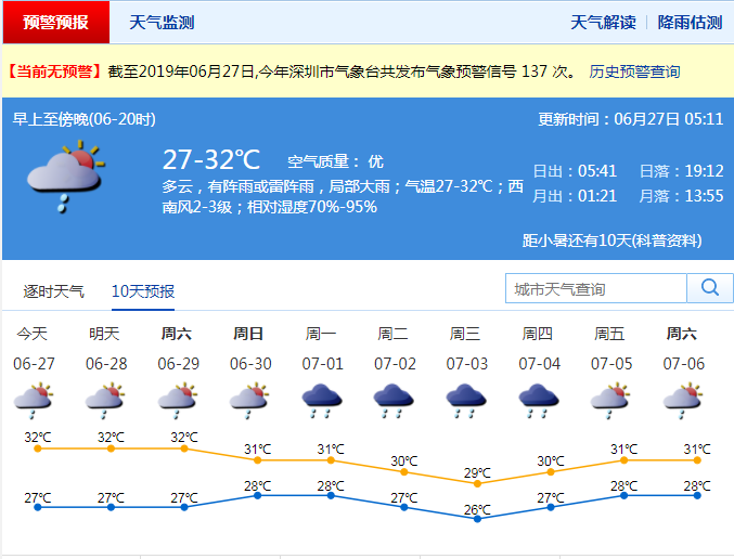 深圳新聞網(wǎng)2019年6月27日訊 昨天下午持續(xù)多日的陰雨天氣也趨于結(jié)束,但隨著降雨減弱,陽光重現(xiàn),氣溫也隨之回升。預(yù)計(jì)27-29日多云,有陣雨或雷陣雨,部分時(shí)間雨勢(shì)較大;30日至7月1日仍有陣雨或雷雨;未來4-5天降雨總體陽光陣雨相伴,天氣趨于炎熱。