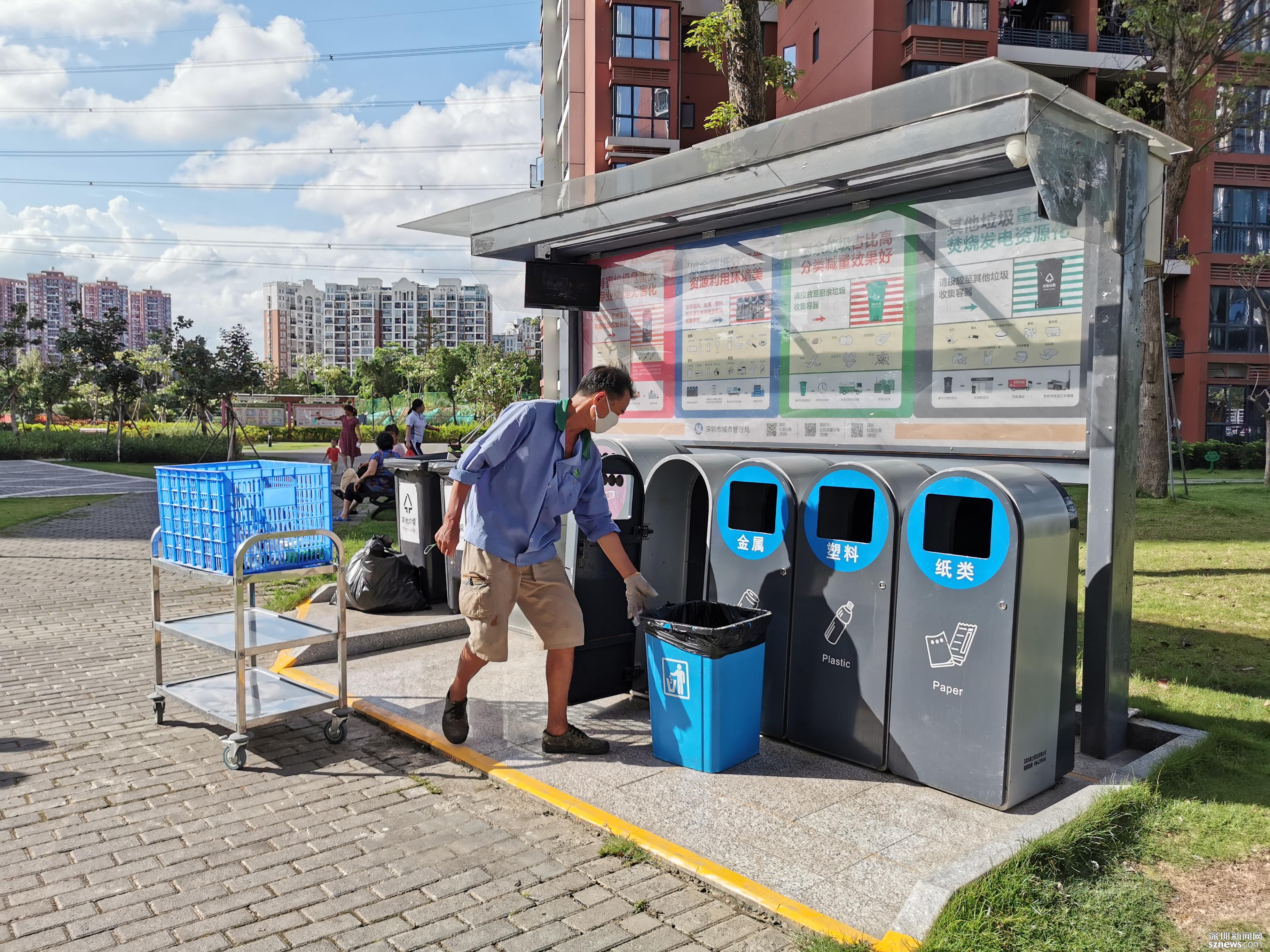 鄧伯今年60歲,是來深圳帶孫子的,因為老伴能幫忙,所以他應聘成為了一名小區(qū)清潔員。小區(qū)實行垃圾分類一年多以來,鄧伯工作輕松了很多。每天他只需巡視幾遍垃圾桶,將滿了的垃圾裝在框里帶回暫存點,進行二次分揀和清洗后,再將垃圾桶歸放原處;等物業(yè)在微信平臺上聯(lián)系好運送車輛,協(xié)助運送人員運走垃圾就行。