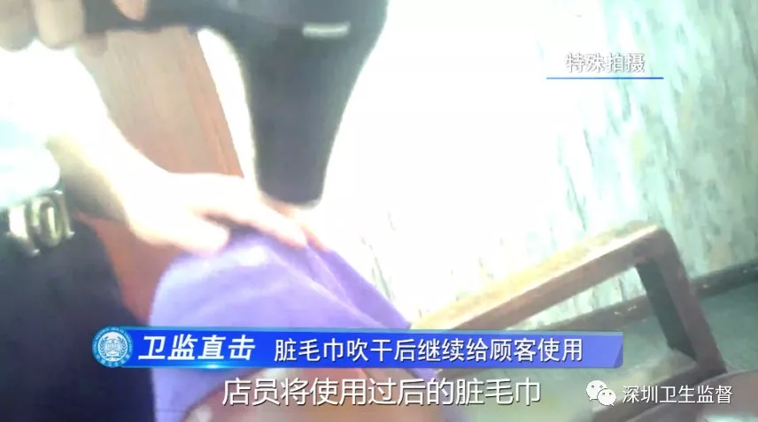 更讓人無(wú)法接受的是,當(dāng)干凈毛巾不夠用的時(shí)候,店員將使用過后的臟毛巾,未經(jīng)過清洗消毒,就用吹風(fēng)機(jī)吹干后,重新放回干凈毛巾取用架內(nèi),繼續(xù)直接給顧客洗頭、擦臉用。