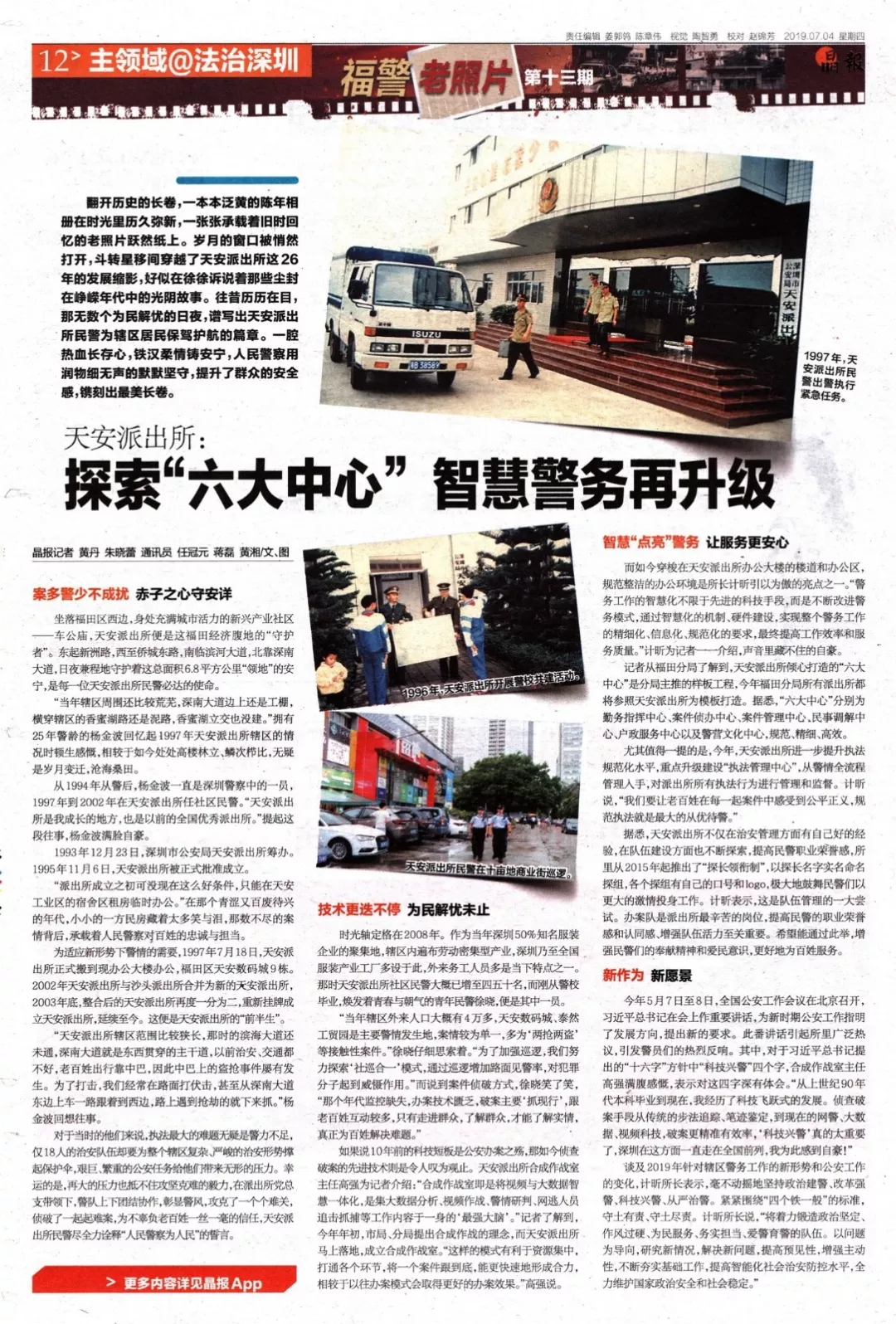 新作為新愿景今年5月7日至8日,全國公安工作會議在北京召開,習(xí)近平總書記在會上作重要講話,為新時期公安工作指明了發(fā)展方向,提出新的要求。此番講話引起所里廣泛熱議,引發(fā)警員們的熱烈反響。其中,對于習(xí)近平總書記提出的“十六字”方針中“科技興警”四個字,合成作戰(zhàn)室主任高強滿腹感慨,表示對這四字深有體會?!皬纳鲜兰o(jì)90年代本科畢業(yè)到現(xiàn)在,我經(jīng)歷了科技飛躍式的發(fā)展。偵查破案手段從傳統(tǒng)的步法追蹤、筆跡鑒定,到現(xiàn)在的網(wǎng)警、大數(shù)據(jù)、視頻科技,破案更精準(zhǔn)有效率,‘科技興警’真的太重要了,深圳在這方面一直走在全國前列,我為此感到自豪!”