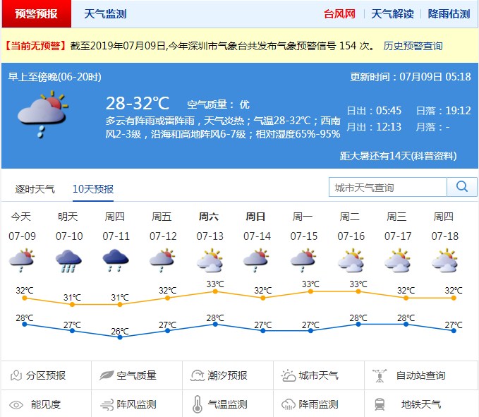 深圳新聞網(wǎng)2019年7月9日訊 近幾天,深圳天氣炎熱,有短時(shí)陣雨,白天最高氣溫達(dá)到31~33 ℃。預(yù)計(jì)9日有陣雨或雷陣雨,10~11日將有一次中到大雨局部暴雨過程,伴有雷暴和7~8級短時(shí)大風(fēng),炎熱天氣將有所緩解。