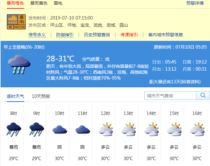 深圳新聞網(wǎng)2019年7月10日訊 7月10日早晨6時50分從深圳市氣象臺獲悉,過去1小時,龍崗區(qū)(寶龍、龍崗、龍城、園山街道、坪地街道)和坪山區(qū)累計雨量已達暴雨,預(yù)計強降雨還將持續(xù)1小時左右,深圳市氣象臺于7月10日6時45分在龍崗區(qū)(寶龍、龍崗、龍城、園山街道)發(fā)布暴雨橙色分區(qū)預(yù)警,7時15分又在坪山區(qū)和龍崗區(qū)坪地街道發(fā)布暴雨橙色分區(qū)預(yù)警。全市進入暴雨防御狀態(tài),請注意防御。全市中小學、幼兒園可視情況推遲上學。