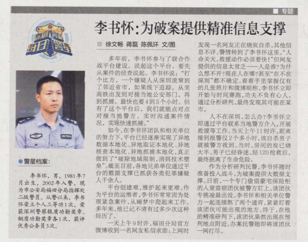多年前,李書懷參與了聯(lián)合作戰(zhàn)平臺建設(shè)。說起這個平臺,要先從案件的偵查說起。李書懷說:“打個比方,一個嫌疑人從深圳流竄到了鄰近省市,如果線下追蹤,從坐高鐵出發(fā)到對接當(dāng)?shù)毓膊块T,再到抓捕,最快也要4到5個小時。但有了這個平臺后,我們就能點對點對接當(dāng)?shù)鼐剑瑢崟r溝通案件情況,實現(xiàn)快速抓捕?!?/p>