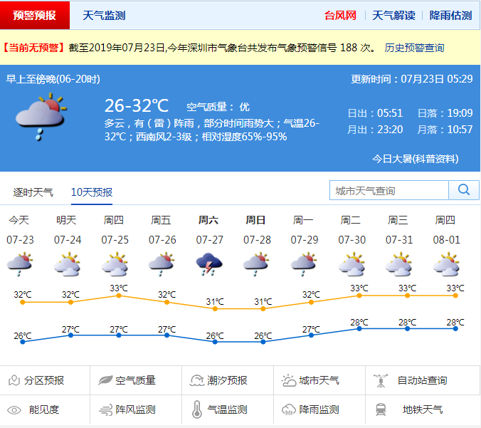 深圳新聞網(wǎng)2019年7月23日訊 市氣象局預(yù)計深圳23日多云為主,有(雷)陣雨,部分時間雨勢較大,局部地區(qū)雨量可達中到大雨量級;氣溫27-32℃,中午前后體感略顯悶熱;西南風2-3級;相對濕度65%-95%。24-26日轉(zhuǎn)炎熱天氣,午后易激發(fā)熱對流性降雨,最高氣溫33-35℃;27-28日降雨增多,部分時間雨勢較大。
