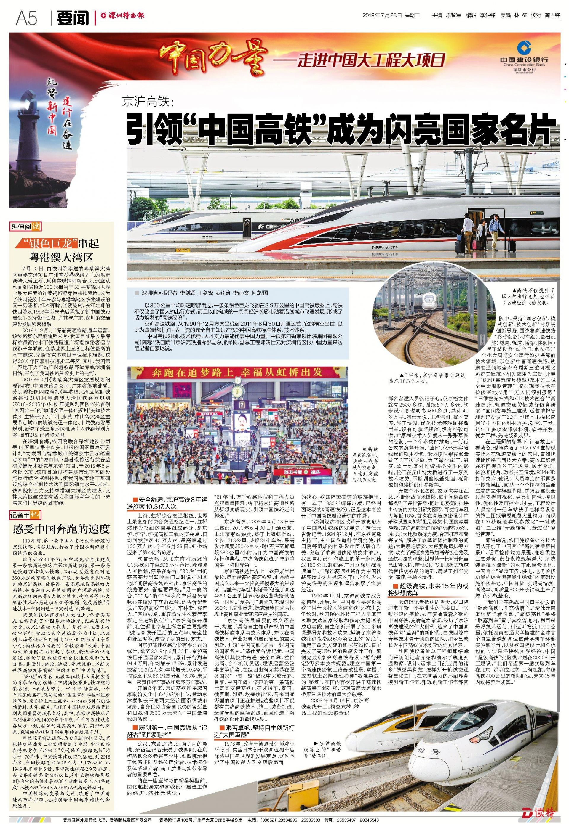 乘坐高鐵馳騁在祖國大地上,記者實(shí)實(shí)在在感受到了中國奔跑的速度,民族復(fù)興的力量。以京滬高鐵為代表,“復(fù)興號”在崇山峻嶺中穿行,帶動沿線交通格局全面升級,北京到上海最快運(yùn)行時間由10小時縮短至4個多小時;構(gòu)建活力四射的“高鐵經(jīng)濟(jì)”長廊,中國兩大經(jīng)濟(jì)圈之間架起了客流、物流等的快速通道,拉動了區(qū)域經(jīng)濟(jì)社會快速發(fā)展和民生改善;其設(shè)計、建設(shè)、運(yùn)營、管理經(jīng)驗,不斷為世界高鐵發(fā)展貢獻(xiàn)“中國方案”“中國智慧”。
