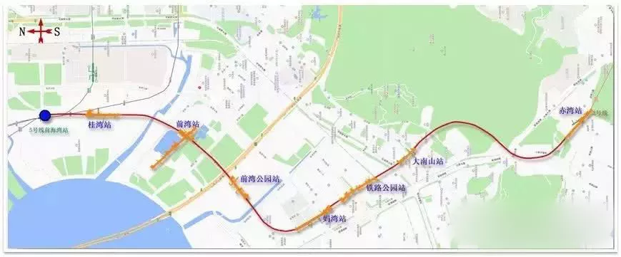 深圳地鐵5號線南延線(二期工程)北起于5號線前海灣站,經(jīng)前海、南山,終點與地鐵2號線赤灣站換乘。
