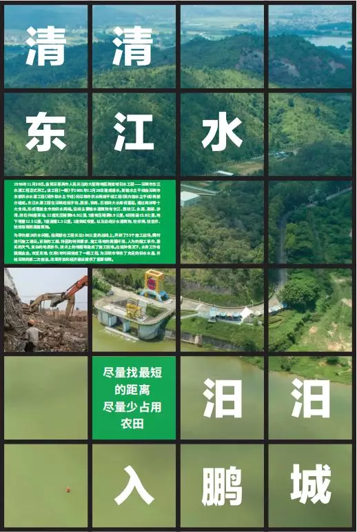 第三部分“清清東江水汩汩入鵬城”,著重展示東江水源工程建設(shè)的全過程。以工程線路為展覽線索,再現(xiàn)水務(wù)工作者在長達(dá)106公里的戰(zhàn)線上奮戰(zhàn)的場面。通過輸水設(shè)施的新舊照片對比,描繪出一條在深惠兩城平地崛起的深圳“生命線”。