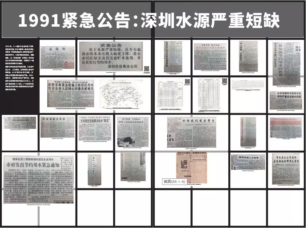第一部分以“1991緊急公告:深圳水源嚴(yán)重短缺”為題,透過多份1991年深圳水荒的相關(guān)報道以及有關(guān)資料,讓觀者了解一個曾經(jīng)極度缺水的深圳。