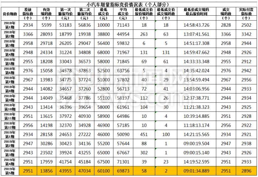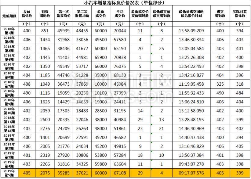 深圳市小汽車增量指標競價情況表(2018年第一期——2019年第五期)