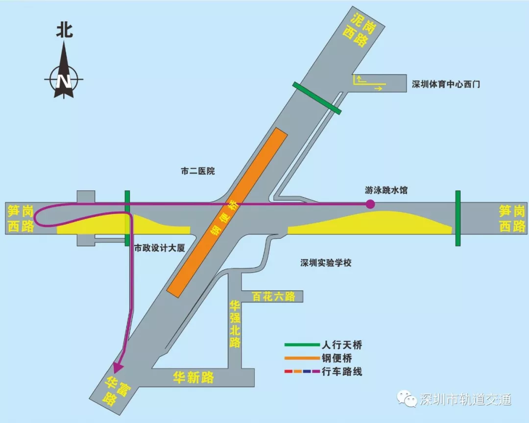 在本次調(diào)整中,華富路-泥崗西路南北向交通只能通過鋼便橋雙向六車道行車。泥崗西路、華富路、筍崗西路左轉(zhuǎn),行人線路及“市二醫(yī)院”,“體育館”公交站臺(tái)均有所調(diào)整。