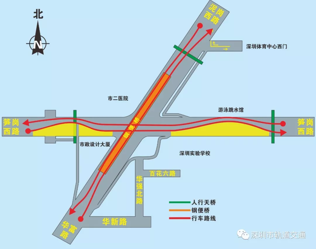 南北向:華富路—泥崗西路取消原通過(guò)平交路口的車(chē)道,轉(zhuǎn)為通過(guò)上鋼便橋?qū)崿F(xiàn)自南向北通行;東西向:筍崗西路東西向直行交通保持不變,取消原平交路口的紅綠燈。(詳見(jiàn)圖3)