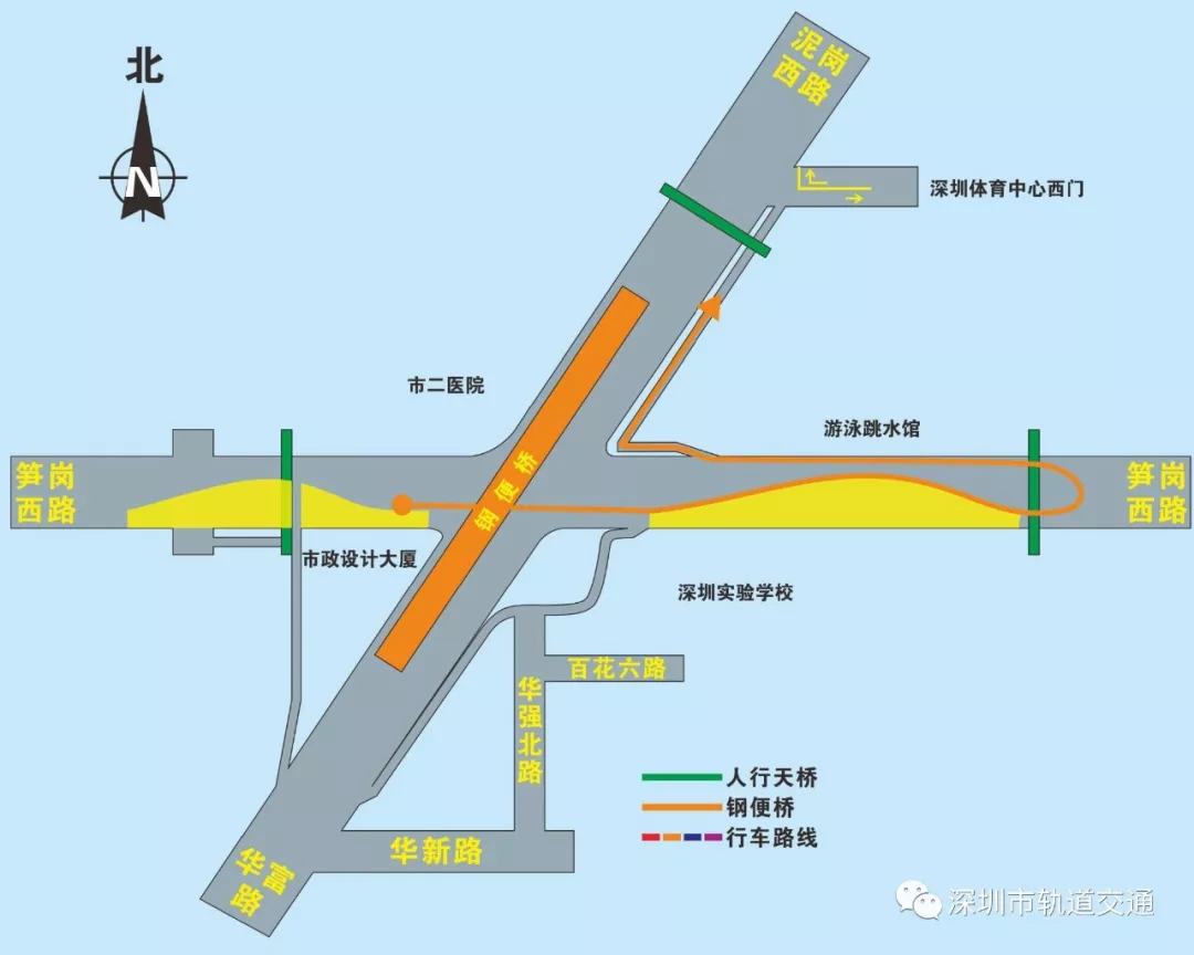 西轉北(筍崗西路左轉泥崗西路):筍崗西路直行通過原平交路口,隨后在體育館南門位置掉頭口處掉頭,然后通過右轉輔道,進入泥崗西路,完成左轉。(詳見圖5)