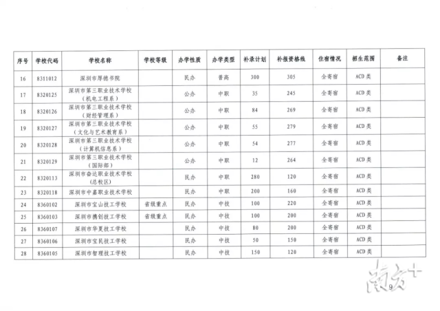 記者梳理發(fā)現(xiàn),目前,深圳市共有16所普高尚有擴招及補錄計劃,補錄人數(shù)2430人,最高補錄分?jǐn)?shù)線為377分。此外,全市還有4所中職學(xué)校與7所中技學(xué)校進行擴招與補錄,補錄人數(shù)共1367人,最高補錄分?jǐn)?shù)線為316分。