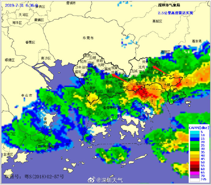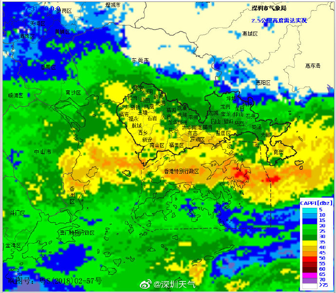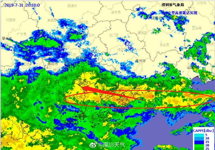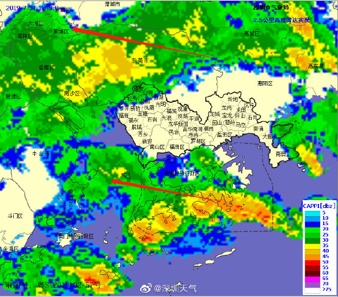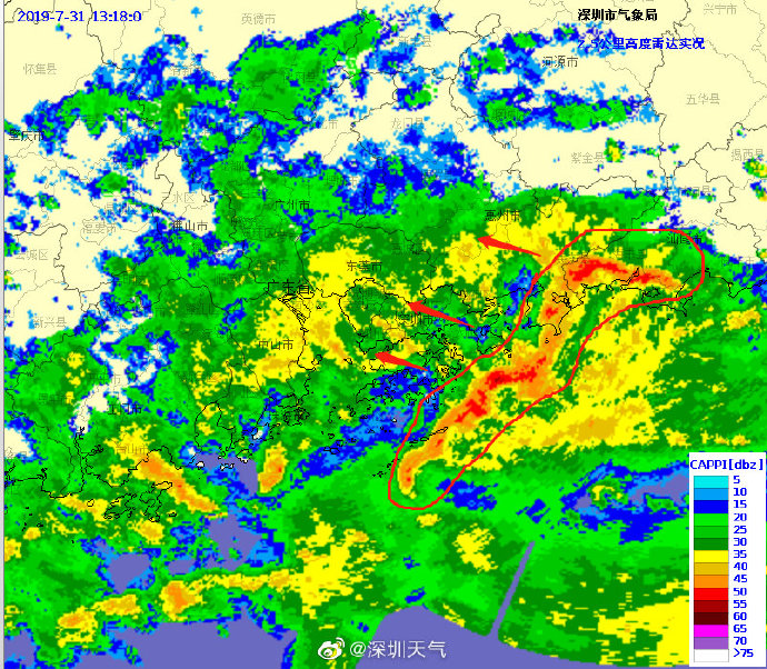 當(dāng)一條雨帶的長(zhǎng)軸和雨帶的移動(dòng)方向(箭頭)夾角很小時(shí),某個(gè)地方就會(huì)被這條雨帶幾乎從頭到尾地經(jīng)過(guò),于是這個(gè)地方的累計(jì)雨量就會(huì)特別大。而現(xiàn)在深圳靠南的大部分區(qū)域就在經(jīng)歷一場(chǎng)列車(chē)效應(yīng),所以這場(chǎng)雨持續(xù)時(shí)間比較長(zhǎng),短時(shí)間內(nèi)停不下來(lái)。
