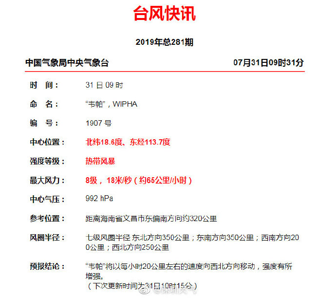 截至7月31日22時(shí),臺(tái)風(fēng)“韋帕”(熱帶風(fēng)暴級(jí))中心位于廣東省徐聞市東偏南方向約220公里的南海西北部海面上,中心附近最大風(fēng)力9級(jí),達(dá)到每秒23米的風(fēng)速,六級(jí)大風(fēng)半徑范圍約480公里。