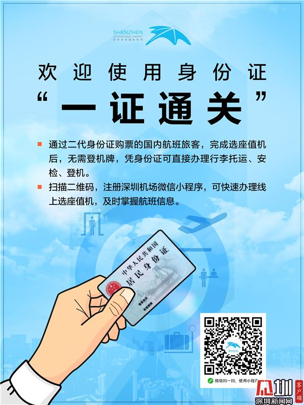 深圳新聞網(wǎng)2019年8月1日訊(見(jiàn)圳客戶(hù)端、深圳新聞網(wǎng)記者 涂勝 通訊員 葉丹)記者從深圳機(jī)場(chǎng)了解到,即日起,深圳機(jī)場(chǎng)全面試行國(guó)內(nèi)航班身份證“一證通關(guān)”服務(wù)。今后,使用二代身份證購(gòu)買(mǎi)機(jī)票的旅客,在完成選座值機(jī)后,僅需出示身份證即可直接辦理行李托運(yùn)、安檢和登機(jī)手續(xù),全程無(wú)需再出示登機(jī)牌。