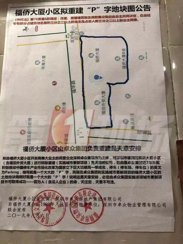 在福僑大廈小區(qū)公告欄里,出現(xiàn)了一張小區(qū)擬重建“p”字地塊圖的公告,落款為深圳市卓眾房地產(chǎn)集團(tuán)有限公司,擬重建的地塊包括福僑大廈A、B座和福田外貿(mào)大廈,文中寫(xiě)道,福僑大廈由卓眾房地產(chǎn)集團(tuán)負(fù)責(zé)重建是天意安排。