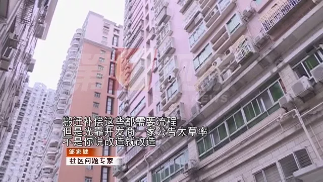 而社區(qū)問題專家鄒家健表示,城市的更新改造有一定程序,開發(fā)商需要先向政府部門進行報批,并且按照深圳城市更新政策來說,業(yè)主的城市更新意愿應(yīng)當達100%才可以進行舊改,并非開發(fā)商所說的“雙三分之二”。