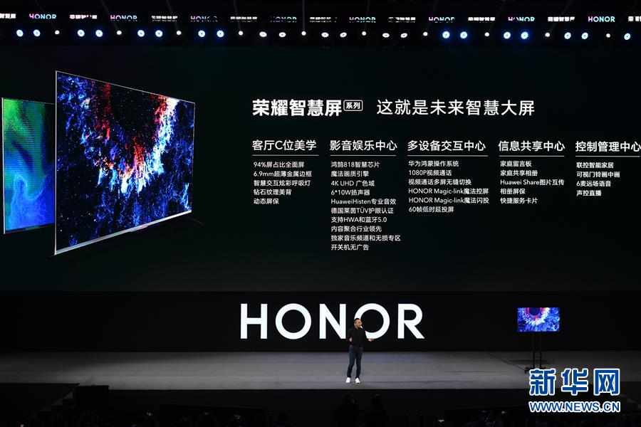 8月10日,華為榮耀總裁趙明在發(fā)布會上介紹榮耀智慧屏。新華社記者 梁旭 攝