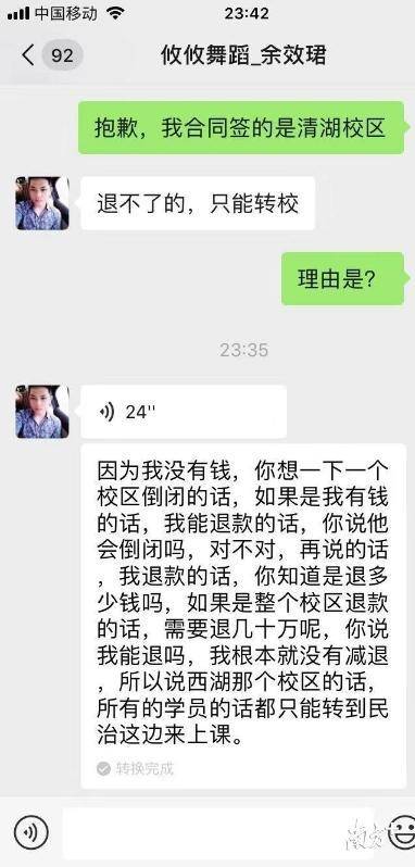 目前,學(xué)員們無法與余效珺保持穩(wěn)定聯(lián)系,但是8月7日與學(xué)員的溝通中,余效珺承認清湖校區(qū)需退的學(xué)費約有幾十萬,他無力退還,只能建議學(xué)員轉(zhuǎn)到民治校區(qū)上課。